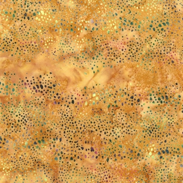 Smukt batikstof i melerede sennepsgule toner med melerede flydende prikker i regnbuens farver.