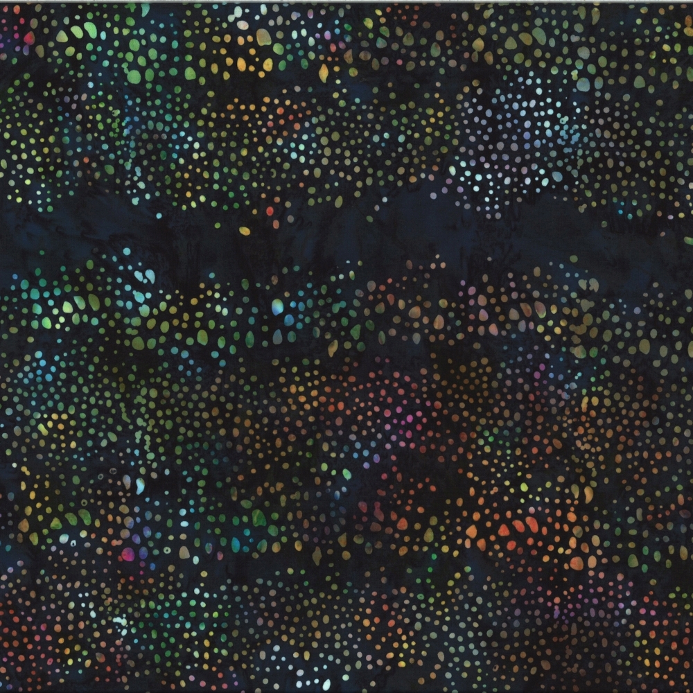 Smukt batikstof i melerede mørkeblå og mørkegrønne toner med melerede flydende prikker i regnbuens farver.