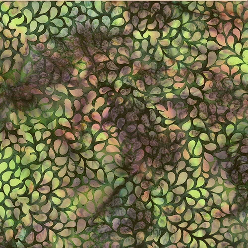 Lækkert batikstof fra Hoffman fabrics med allover dråbeformet mønster i lysegrønne og lyserøde farver på meleret grøn og blå baggrund.