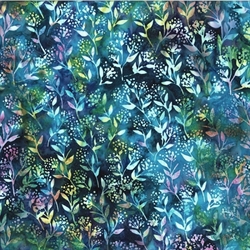Hoffman fabrics laver det flotteste batiktryk med klare farver, her i melerede mørkeblå og violette toner med små blomsterkviste og prikker i glade melerede farver: lysegul, creme, turkisblå, saftig grøn og lyserød. Har næsten en neon effekt.