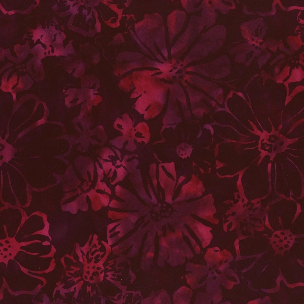 Lækkert batikstof fra Hoffman fabrics i meleret sorte og røde toner med forskellige blomster.