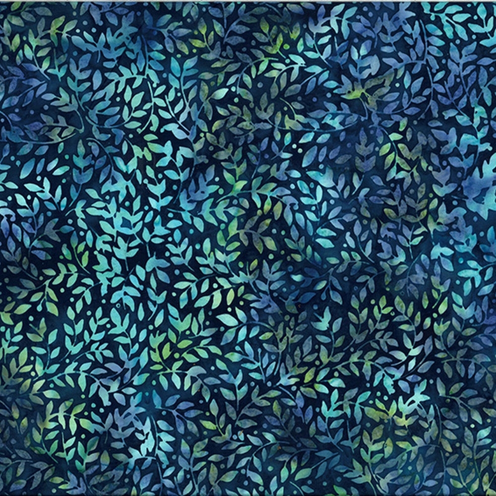Lækkert batikstof fra Hoffman fabrics med små blade og prikker i melerede blå og grønne farver på meleret mørkeblå baggrund.