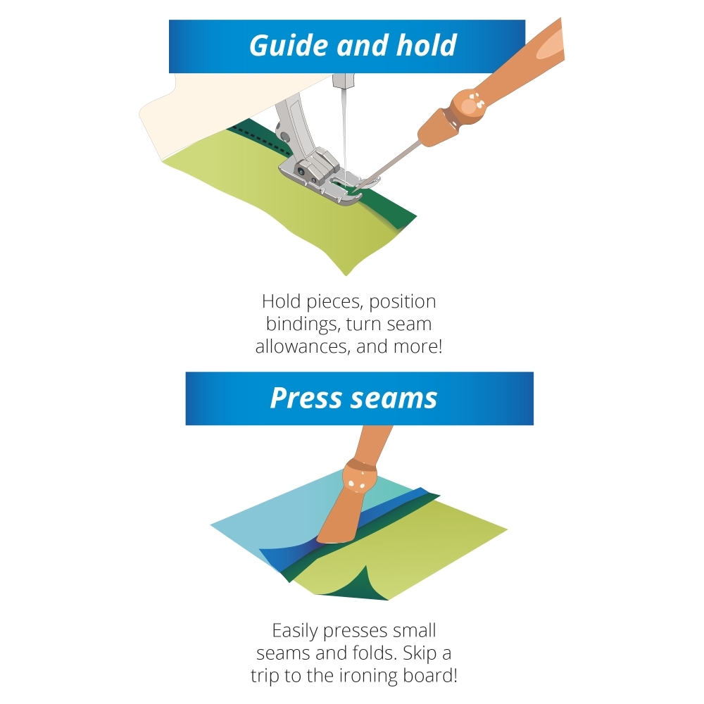 Brug spidsen den til at holde små stofdele, kantbånd og til at vende sømrum når du syer på maskine. Samt som fingerforlænger så du ikke brænder dig på strygejernet når du arbejder med de bitte små stofdele.