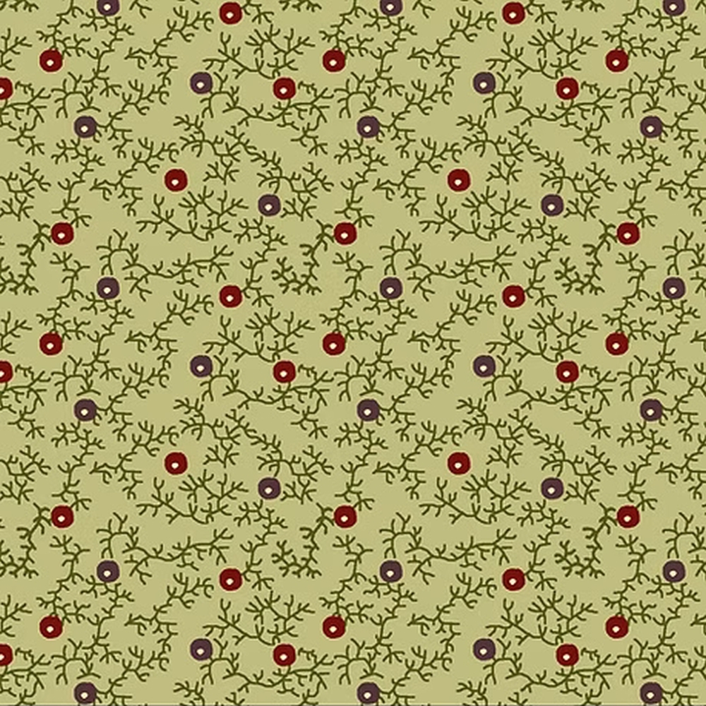 Smukt patchworkstof i moderniseret reproduktionsstil. Stoffet er lysegrønt med olivengrønne grene samt mørkerøde og mørkebrune bær med hvide prikker.