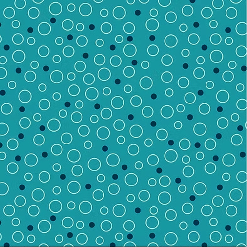 Lækkert patchworkstof i retrostil med små mørkeblå prikker og hvide cirkler/ bobler på petroleums blå baggrund.