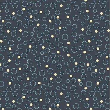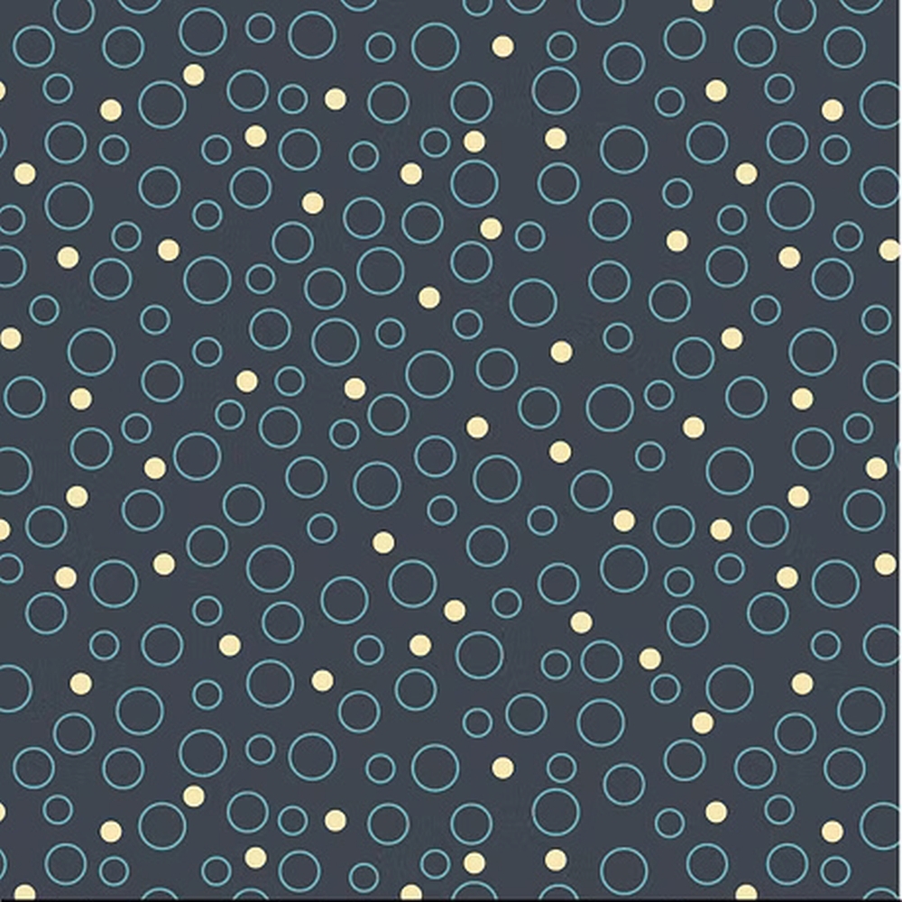 Lækkert patchworkstof i retrostil med små hvide prikker og blå cirkler/ bobler på meget mørkeblå baggrund.