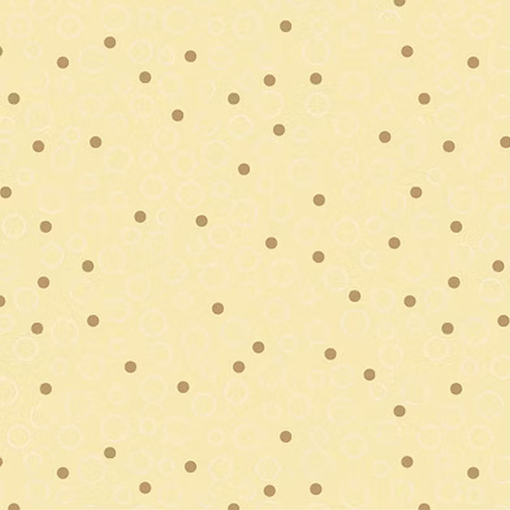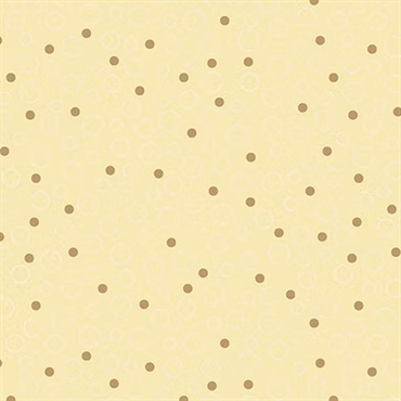 Lækkert patchworkstof i retrostil med lysebrune prikker og hvide cirkler/ bobler på en gylden beige baggrund.