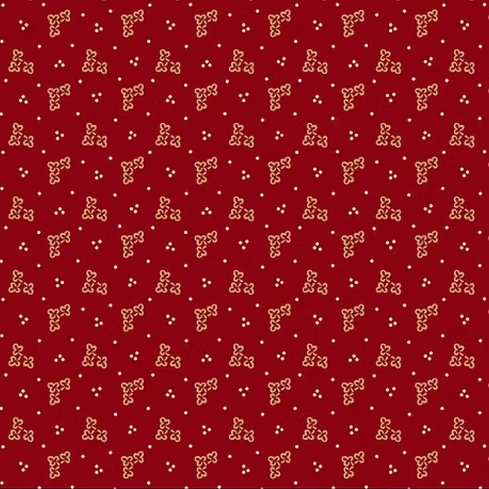 Stoffet er mørke rødt med bittesmå beige kløverblade og prikker.
