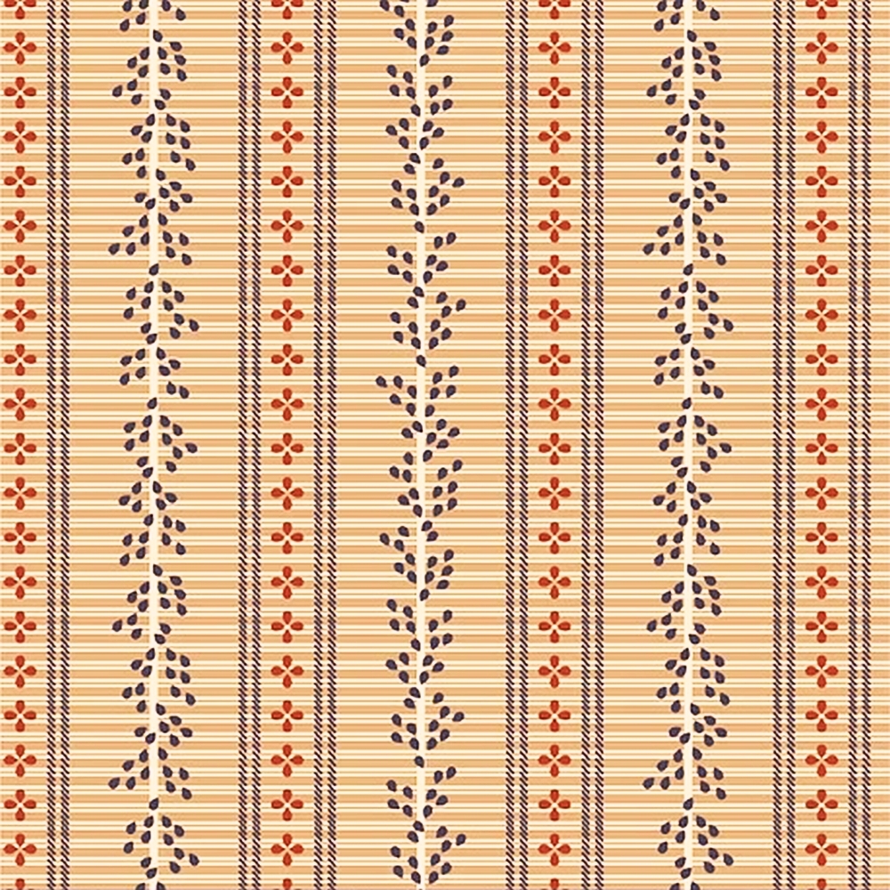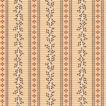 Lækkert patchworkstof i retrostil i varm lysebrun med svage cremefarvede striber på det ene led og skraverede mørkeblå striber på det andet der ligner små sting eller reb. Mellem striberne er der skiftevis små mørkerøde prikker der danner en lille blomst og cremehvide stængler med små mørkeblå blade.
