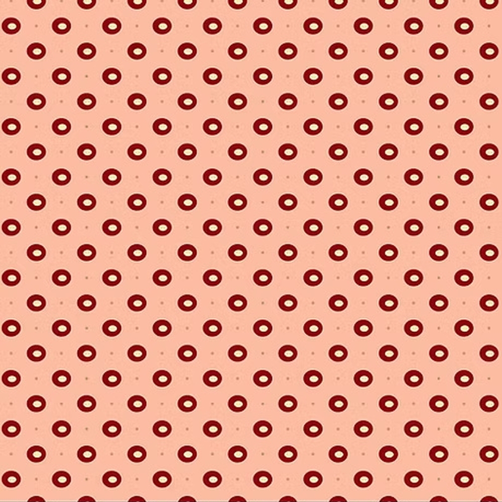 Lækkert patchworkstof i country stil i støvet lyserød med mørkerøde og hvide prikker.