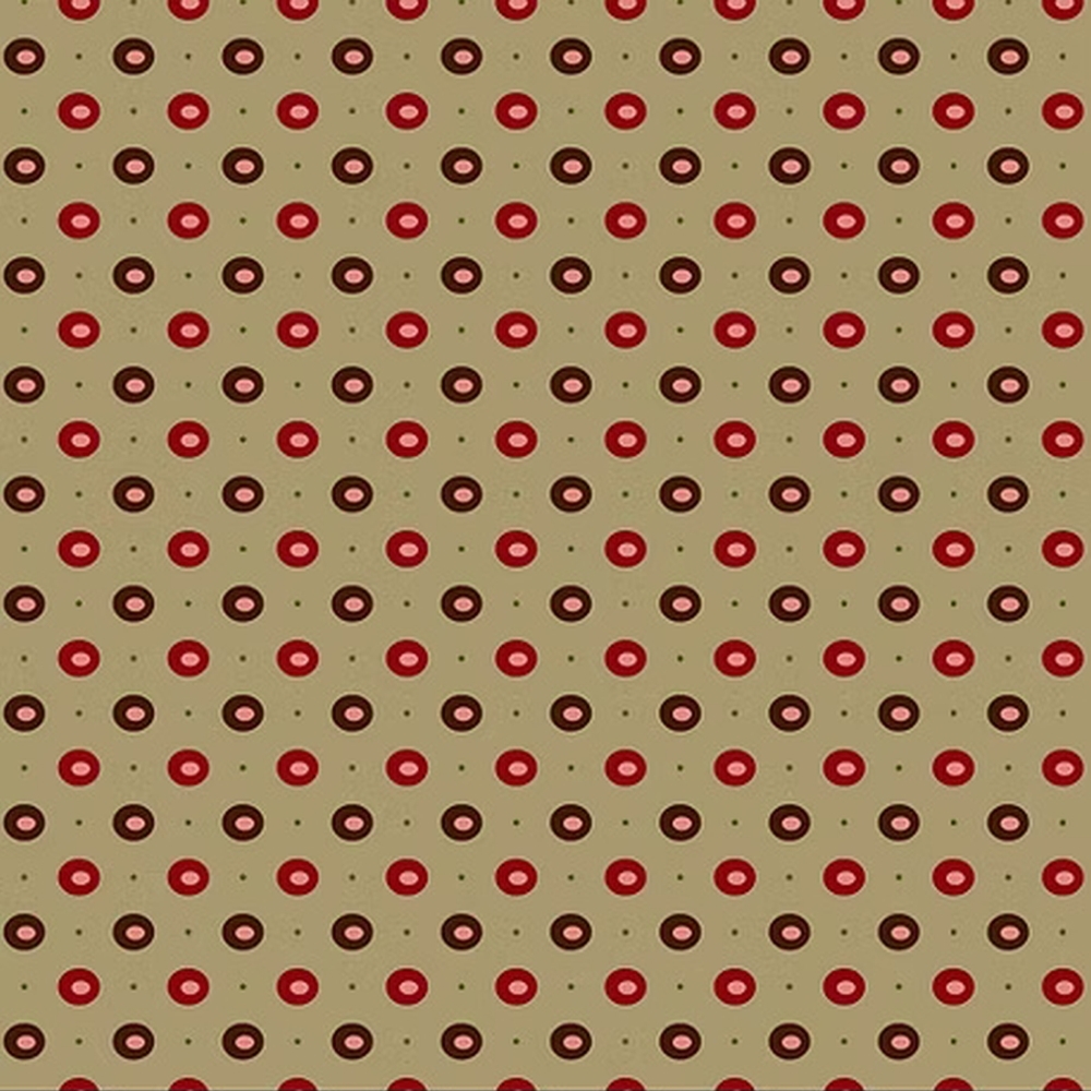 Lækkert patchworkstof i country stil i grønlig beige med mørkerøde og brune prikker med lyserødt i midten.