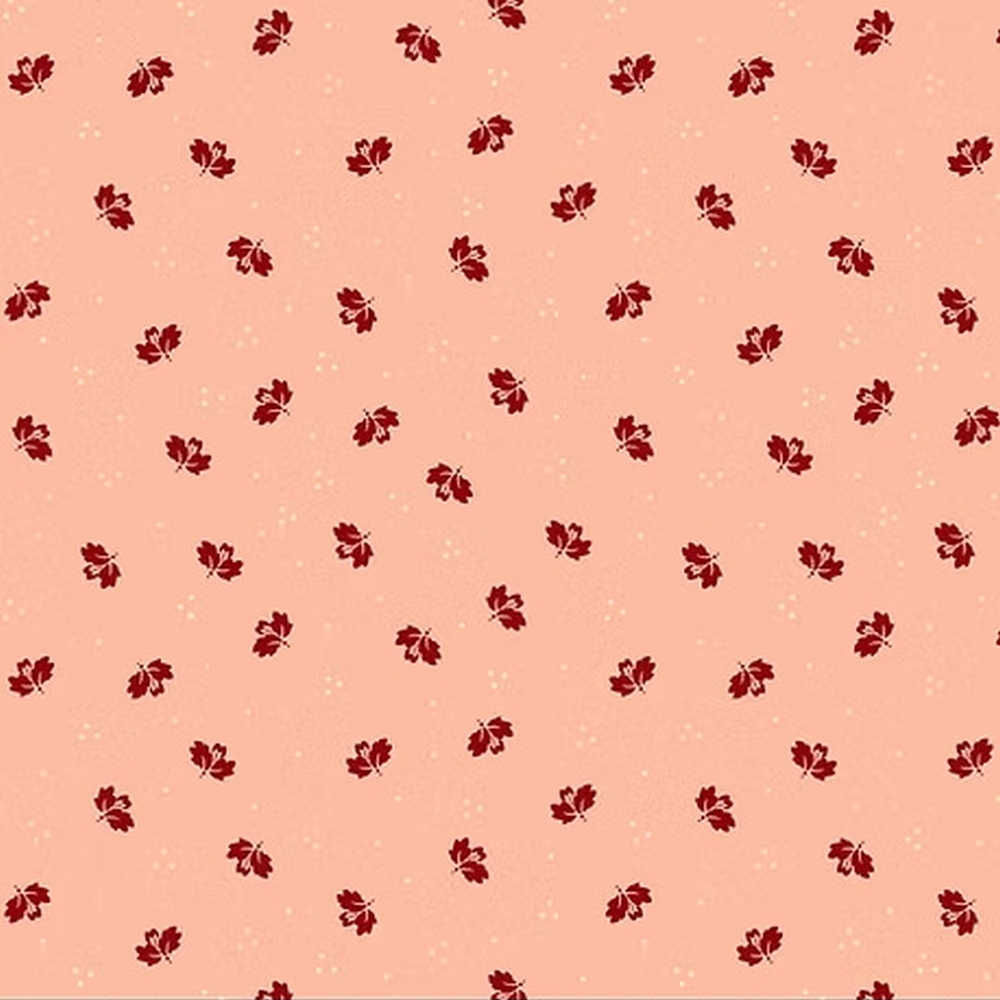 Lækkert patchworkstof i country stil i støvet lyserød med små efterårsblade i mørkerødt og bittesmå hvide prikker.
