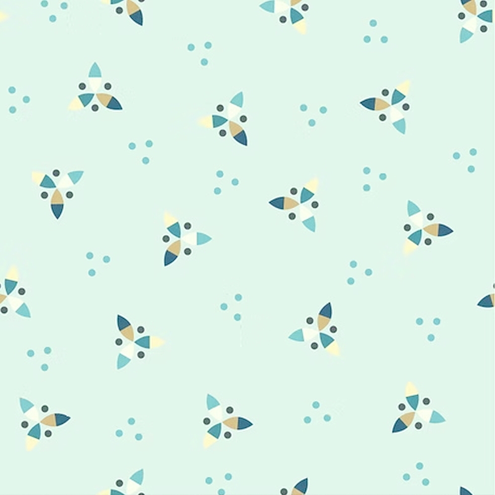 Lækkert patchworkstof i retrostil med små propeller i hvid, beige, mørkeblå og petroleum samt små sorte og petroleumsblå prikker på en lys isblå baggrund.