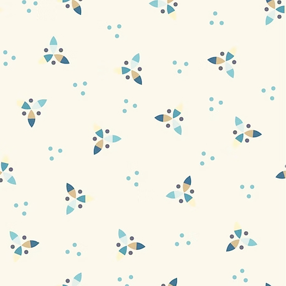 Lækkert patchworkstof i retrostil med små propeller i lyseblåt, beige, mørkeblå og petroleum samt små sorte og petroleumsblå prikker på en råhvid baggrund.