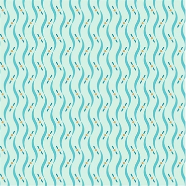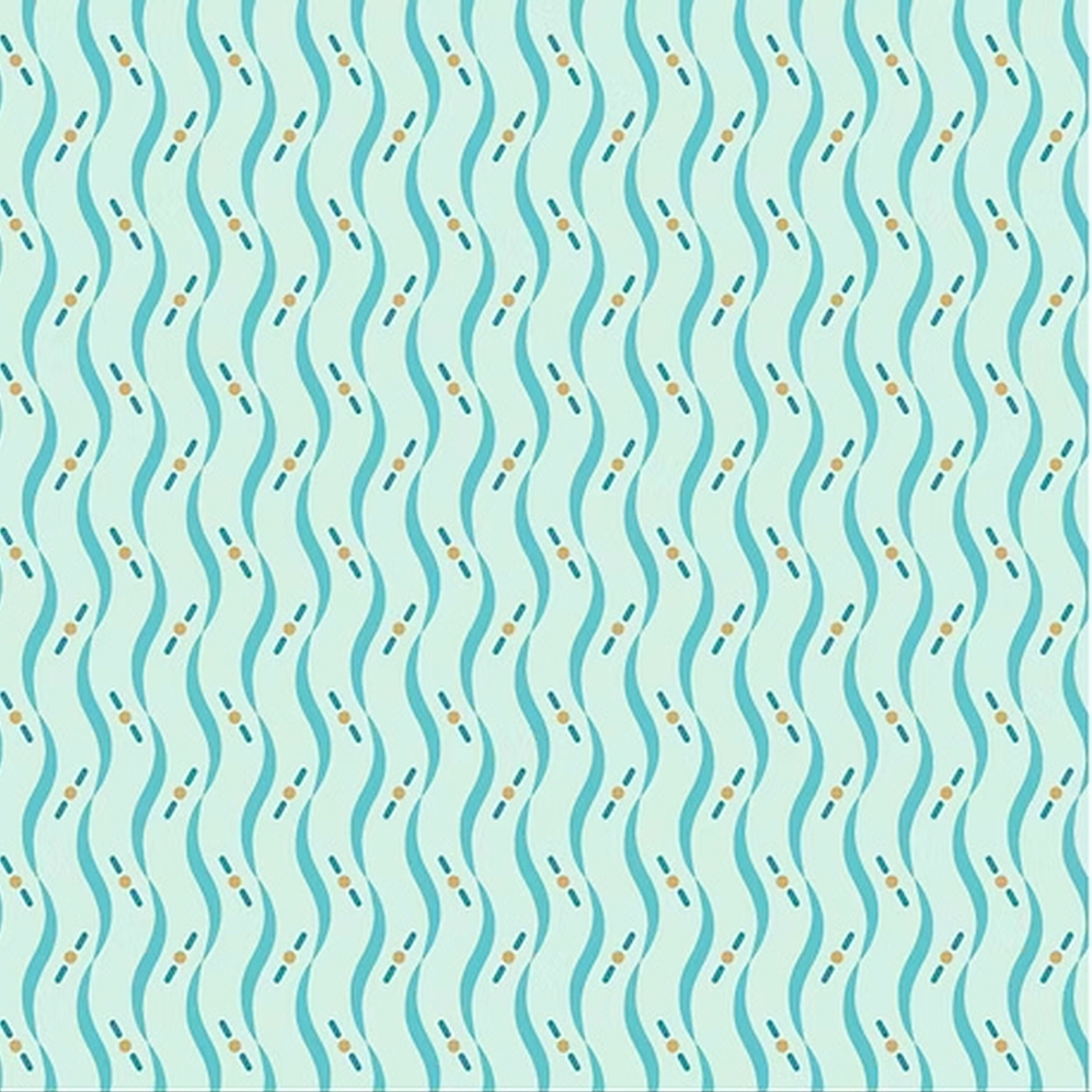 Lækkert patchworkstof i retrostil med bittesmå beige prikker og mørkeblå streger samt bølgende havblå striber på en lys isblå baggrund.