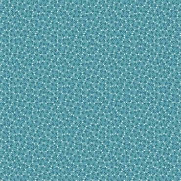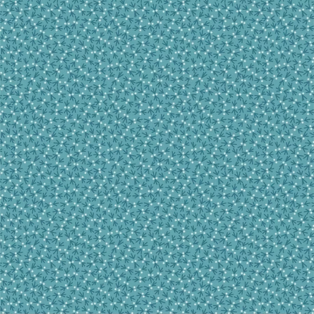Lækkert patchworkstof i retrostil med bittesmå mørkeblå fuglespor og hvide prikker på petroleums blå baggrund.