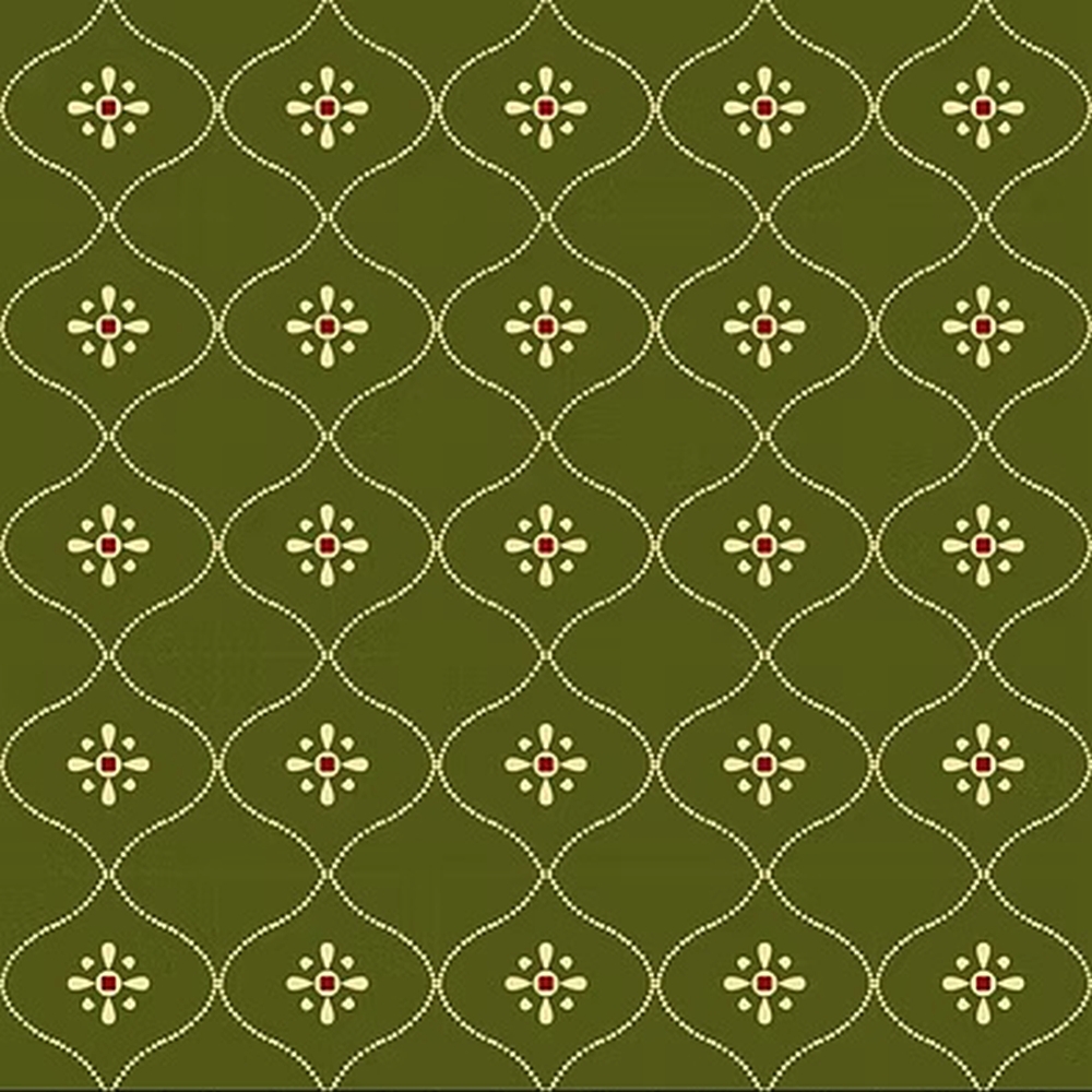Lækkert patchworkstof i country stil, olivengrønt med hvidt tapet-inspireret mønster med små røde prikker i midten.