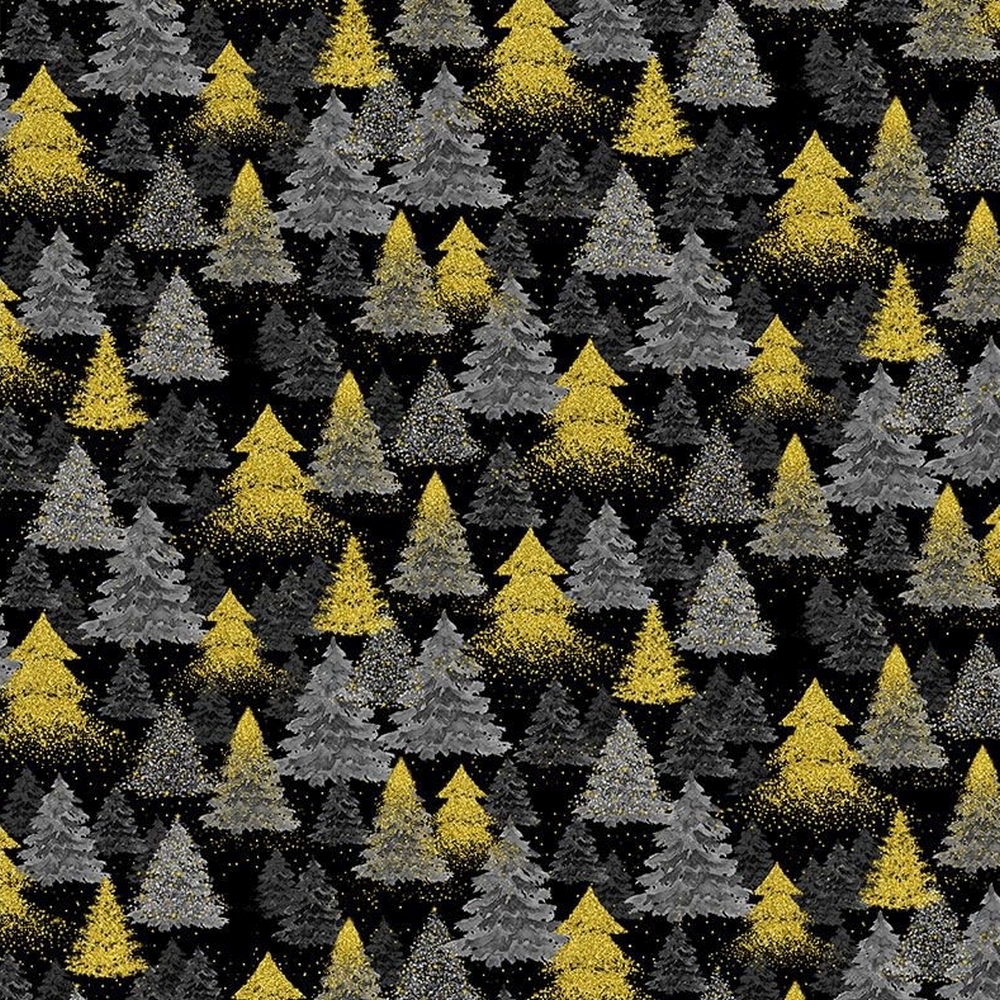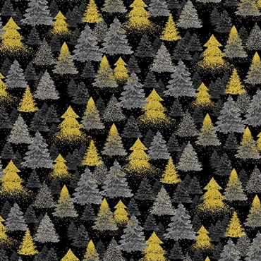 Flot sort julestof fra Timeless Treasures med grå og guldfarvede juletræer.