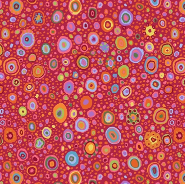 Mørkerødt stof med irregulære prikker og bobler i orange, pink, limegrønne, blå og lilla farver.