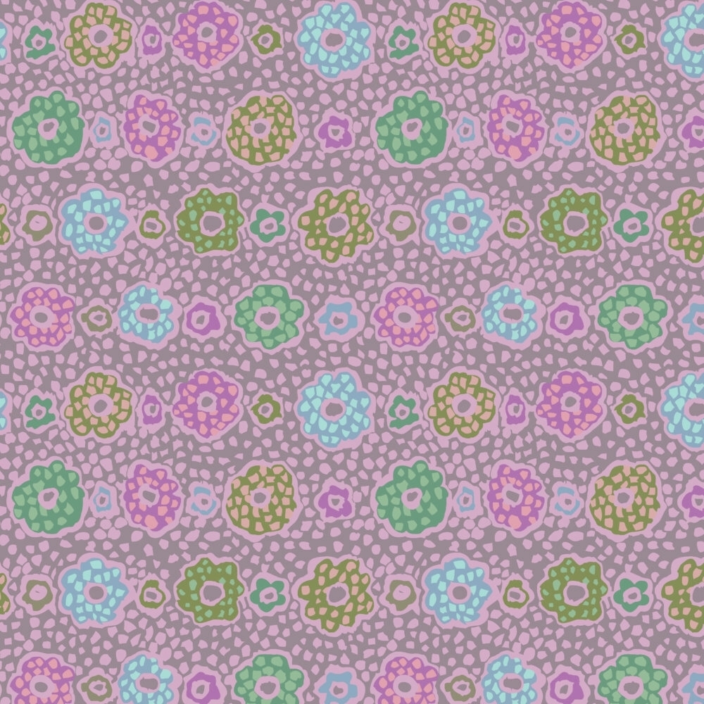 Simple stiliserede blomster med lyslilla omrids og uregelmæssige prikker i støvede grønne, blå, lilla og orange farver på mørkegrå baggrund med uregelmæssige lyslilla prikker.