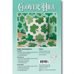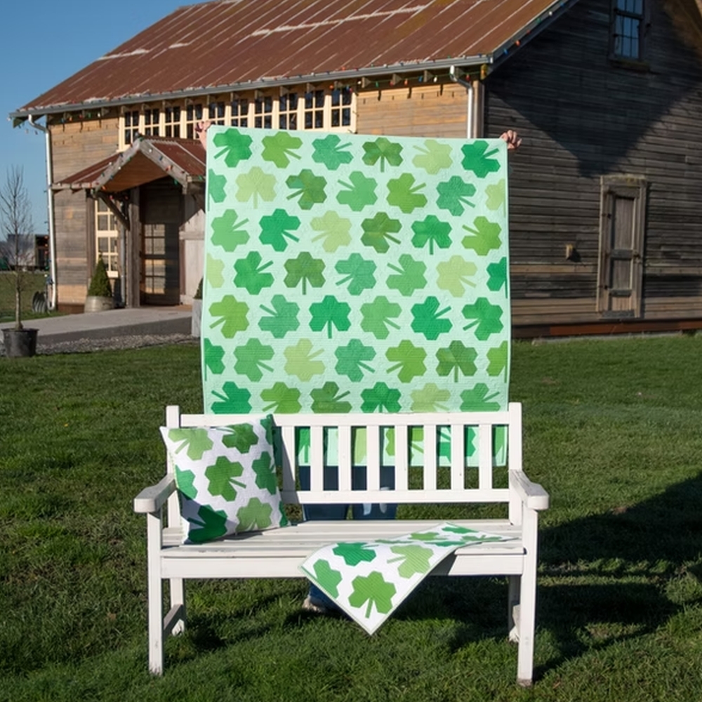 Hyggeligt mønster til quilt, løber og pude med kløverblade fra Krista Moser, der gør brug af Creative Grids 60° Diamond tiny linealen.