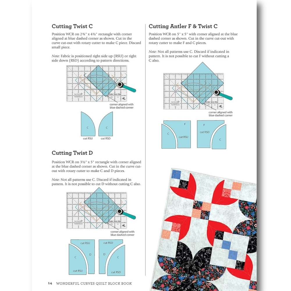 Bogen fortæller dig også hvordan man bruger Wonder Curve Ruler linealen og der er trin for trin instruktioner til hver blok, samt quilte tips og forslag.