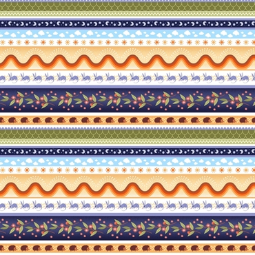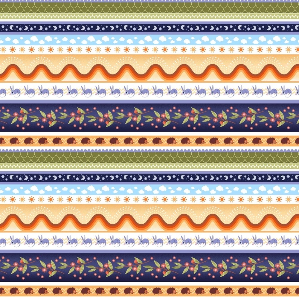 Striberne har forskellige bredder i dæmpede grønne, lyseblå, orange, blålilla, hvide, brune, natteblå og sart lyserøde farver, nattehimmel, himmel med skyer, pindsvin og bilby pungdyr, blomster med blade og kurvede former.