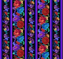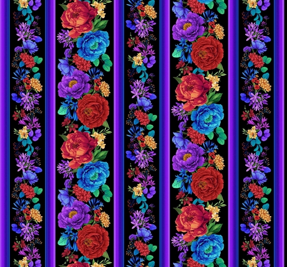 Smukt patchworkstof fra Timeless Treasures med realistisk blomsterprint i intense levende farver imellem blå og lilla striber på sort baggrund.