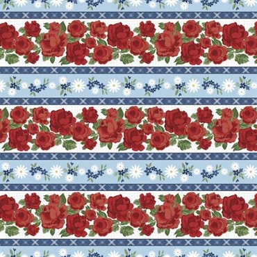 Lækkert patchworkstof fra Wilmington med stiliserede blomster på brede striber. Røde roser på hvidt og grå ternet bånd samt små blå blomster med grønne blade og margueritter på lyseblåt bånd med mørkeblå skotskternede striber imellem.