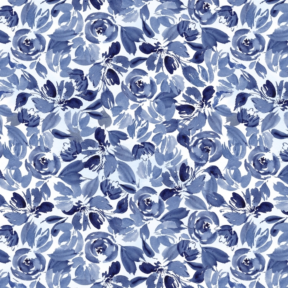 Lækkert patchworkstof fra Wilmington med allover blomsterprint i marineblå toner på hvid baggrund.