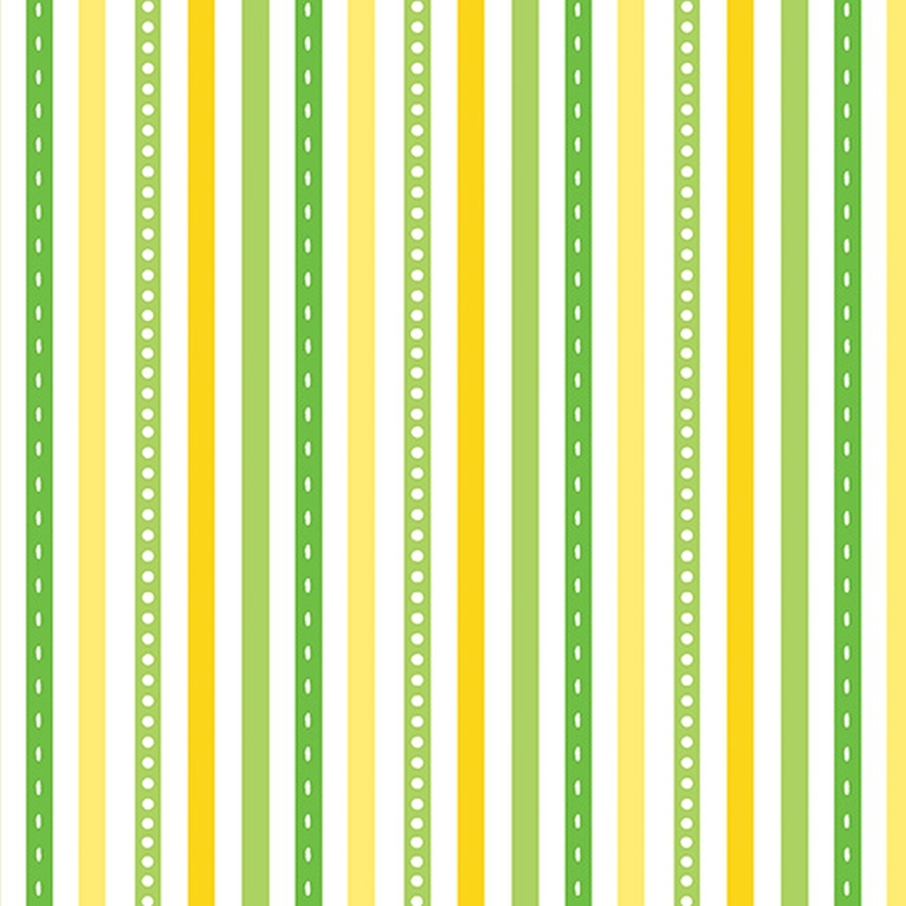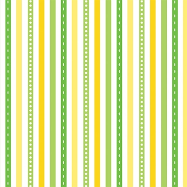 Stribet patchworkstof fra Benartex i glade farver, hvid, gul, grøn og lysegrøn, de grønne med hvide prikker.