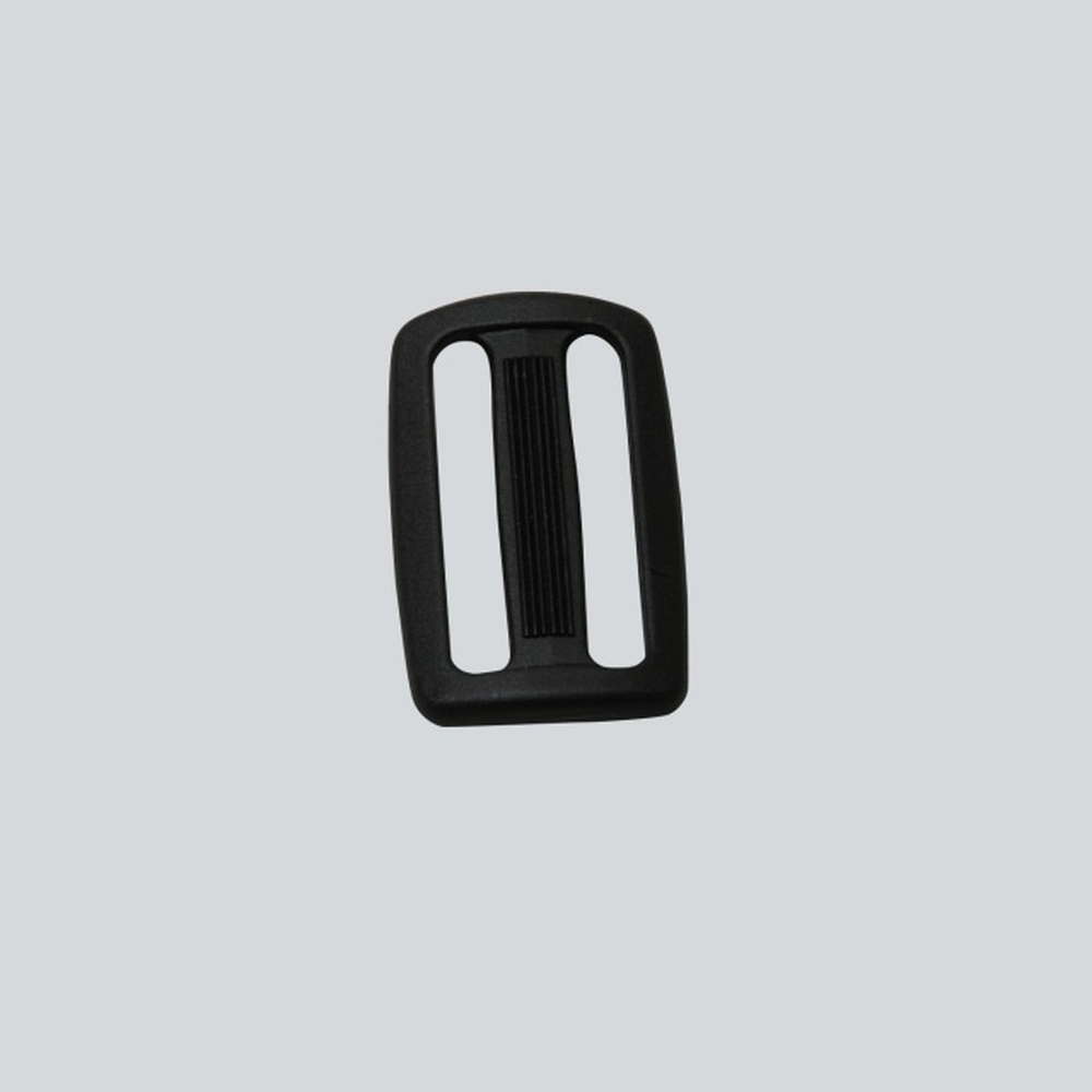 Udført i sort kunststof med afrundede hjørner og små riller der holder på stropperne. Spændet har 2 åbninger på 2,25cm.